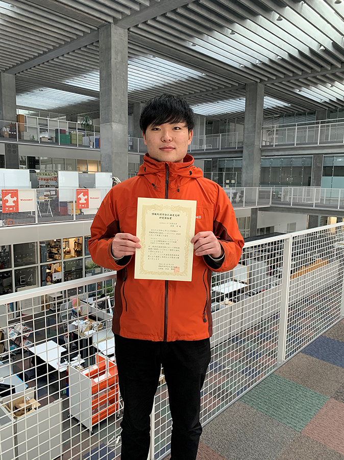 2020年11月 November, 2020 に開催された国内会議である情報処理北海道シンポジウム2020において、菅原 淳さん(大学院博士(前期)課程1年 情報アーキテクチャ領域、指導教員:竹川 佳成准教授)が、プログラミング演習における課題の得点から合否を予測する下記の発表を行い、全発表65件の中から優秀な研究発表を行った若手研究者に贈られる研究奨励賞を受賞しました。
