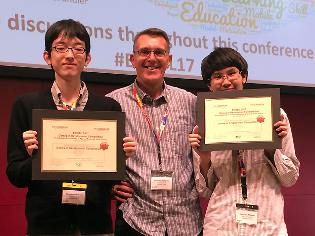 From October 04 to 06, 2017 two Future University students, Tomohiro Sasaki and Takurou Magaki, accompanied Professor Michael Vallance to participate in the European Conference on Game-based Learning in Graz, Austria.