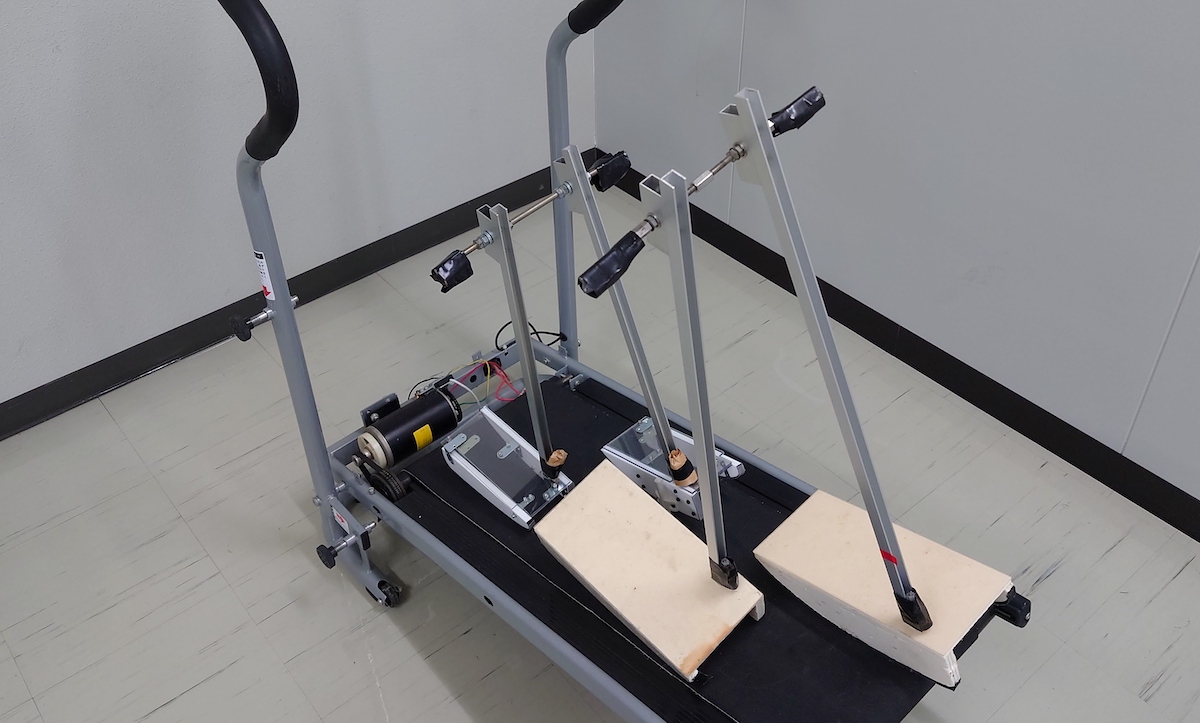 少し傾斜をつけたローラーの上を歩かせている受動歩行ロボット