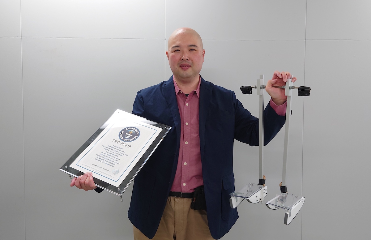 兵頭さんは在学中から、電気エネルギーなどを使わず重力のみで歩き続ける受動歩行ロボットの制作、および受動歩行の歩行分析や福祉機器への応用に取り組んでいます。2011年には、兵頭さんの博士研究を引き継いだ未来大の後輩が、受動歩行ロボットの最長歩行時間のギネス世界記録を塗り替えました。兵頭さんは現在、受動歩行ロボットを起点に、研究のみならず、教育活動や地域社会貢献活動にも精力的に取り組んでいます。
