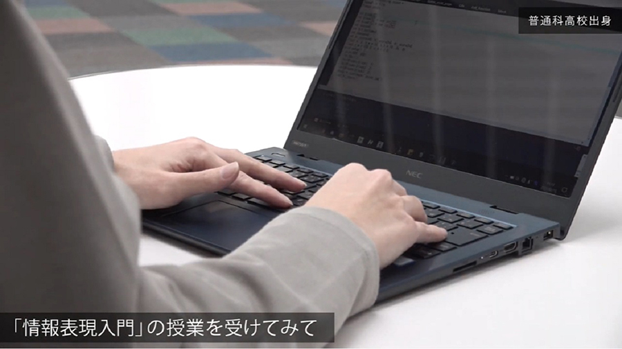 未来大の1年生前期の必修科目「情報表現入門」では、入学後すぐにオリジナルアプリを作るという課題が出ます。1年生の多くは、これがプログラミングに触れる初めての機会となります。学び始めて数週間後には発表会が行われ、優秀作品が選ばれます。高校生の頃からプログラミングに親しんでいた人の作品だけでなく、入学後、初めてプログラミングを習った人の作品も優秀作品として選ばれています。そこには未来大ならではの学習環境が用意されています。この動画では、2020年度 2020 に受講した学生のインタビューと優秀作品の一部を紹介します。