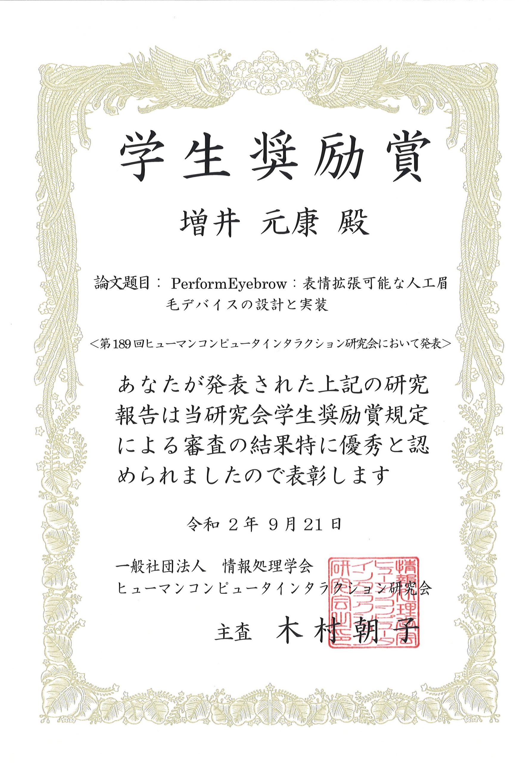 2020年9月7日~8日にオンラインで開催された「第189回HCI研究会」において、博士(前期)課程1年の増井元康さん(情報アーキテクチャ領域、指導教員:竹川佳成准教授)が、学生奨励賞を受賞しました。増井さんは、感情表現に関わる多様な眉毛形状をサーモクロミックインクを用いて提示することで、装着者の表現を拡張できる人工眉毛形状制御デバイスPerformEyebrowを提案しました。