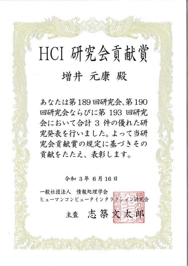博士(前期)課程2年の増井元康さん(情報アーキテクチャ領域、指導教員:竹川佳成准教授)が、情報処理学会・ヒューマンコンピュータインタラクション研究会(HCI研究会) において1年間で3回の発表をした人に与えられる賞である研究会貢献賞を受賞しました。増井さんは以下の3件を発表しました。