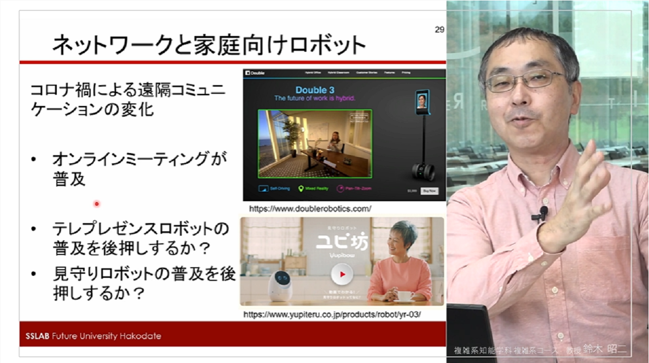 インターネット上ではさまざまなサービスが実現されており、私たちはパソコンやスマートフォンを通じて利用することができます。本授業では、ここにロボットが加わったときにどのようなサービスが実現できるのかを、ロボットの特徴を踏まえながら考えたいと思います。また、人間型であるかどうかといった外見上の特徴だけでなく、ロボットを実現する技術に着目し、実例の紹介を含めてロボットならではのサービスを概観します。