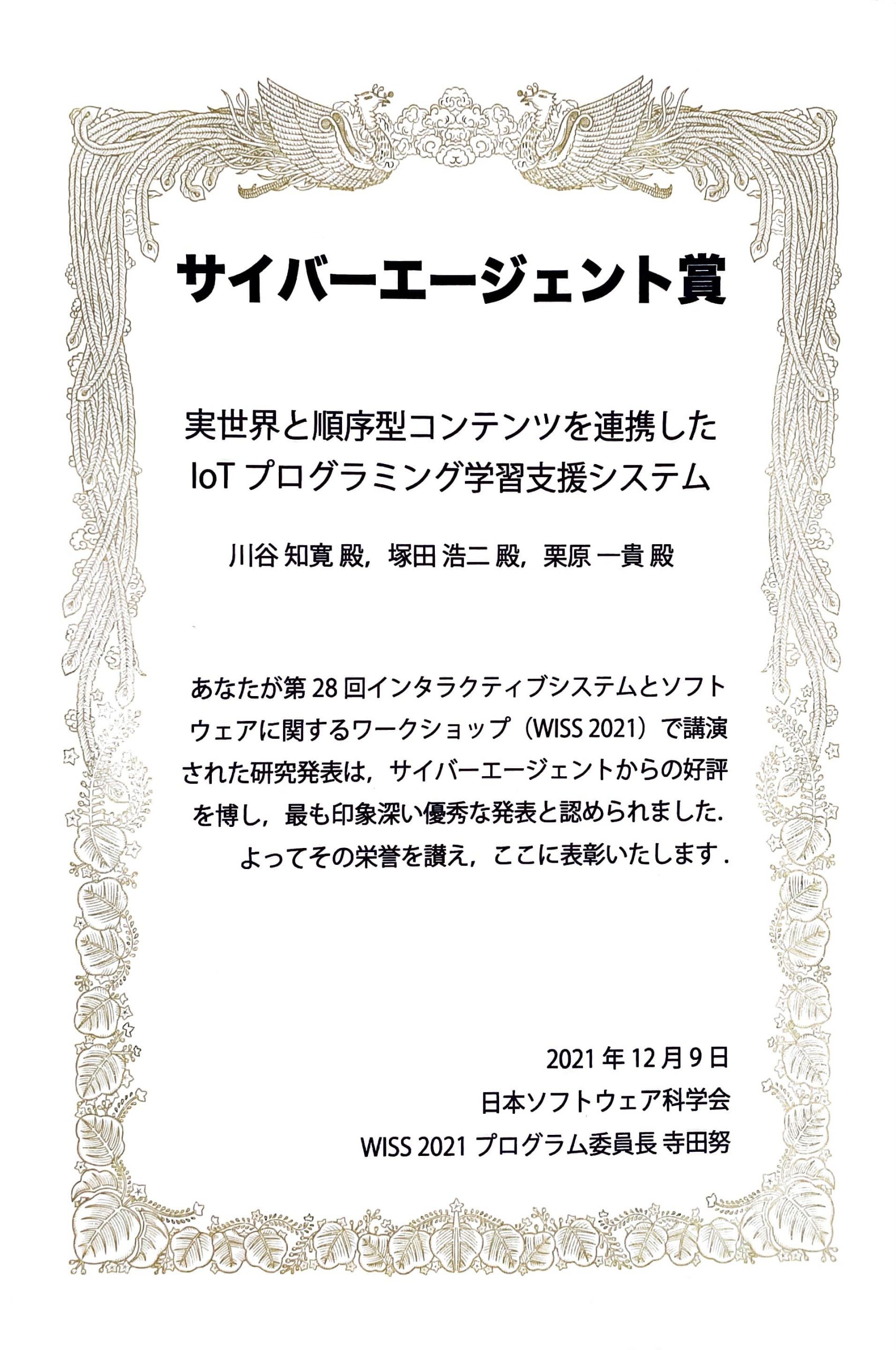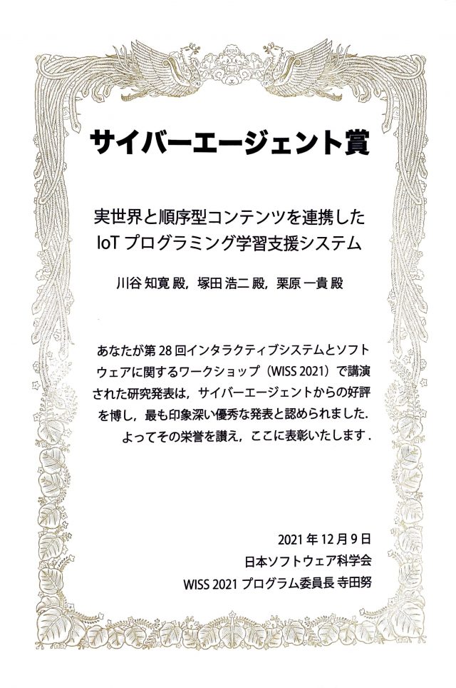 2021年12月8~10日に静岡県のThe HAMANAKO(+オンライン)で開催されたソフトウェア科学会のシンポジウムWISS2021で、博士(前期)課程1年の川谷 知寛さん(情報アーキテクチャ領域、指導教員: 塚田 浩二准教授)が登壇発表(査読有り)を行い、企業賞(サイバーエージェント賞)を受賞しました。