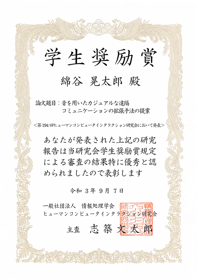 2021年8月 August, 2021 23~24日にオンラインで開催された情報処理学会 第194回ヒューマンコンピュータインタラクション(HCI)研究会にて、博士(前期)課程1年の綿谷 晃太郎さん(情報アーキテクチャ領域、指導教員:塚田 浩二准教授)が、学生奨励賞を受賞しました。