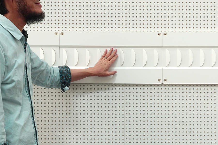 本作品は、当チームが継続的に研究している、手探りで直感的に方向を知ることのできる「触覚矢印-DiGITS(Direction Giving Intuitive Touch Sign)」を、緊急時の経路誘導への情報保証に応用したプロトタイプです。道路トンネルの側壁などにパネル形状の本品を連続的に設置し、暗闇の中にいる人々を安全な場所まで導くような用途を想定しています。