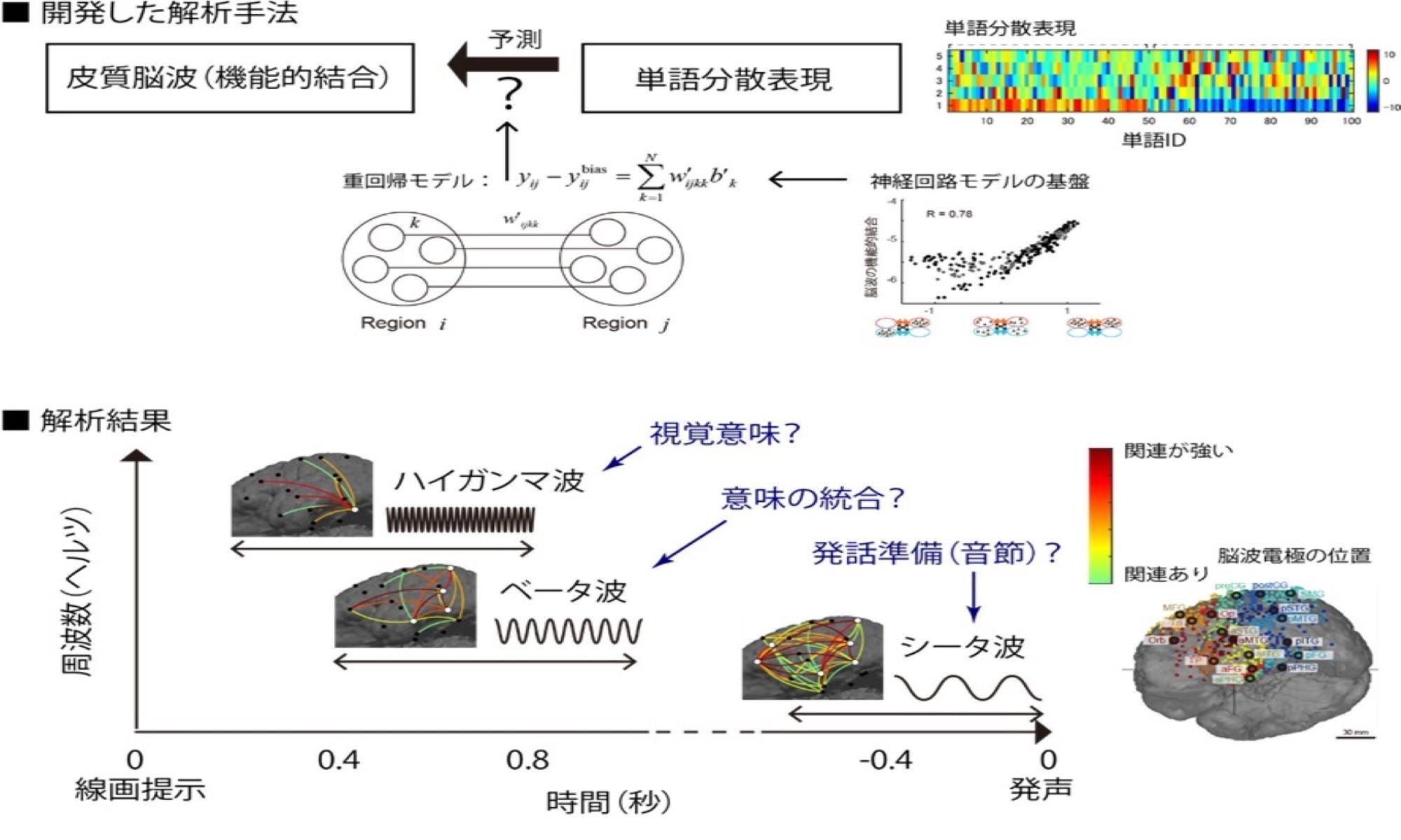 公立はこだて未来大学の佐藤直行教授、京都大学大学院医学研究科てんかん運動異常生理学講座の池田昭夫教授、同・臨床神経学の下竹昭寛助教、神戸大学大学院医学研究科脳神経内科学分野の松本理器教授らの共同研究グループは、分散表現と神経回路モデルを基盤とした脳波解析手法を提案し、物体の意味処理に関わる皮質脳波ネットワークをはじめて検出しました。