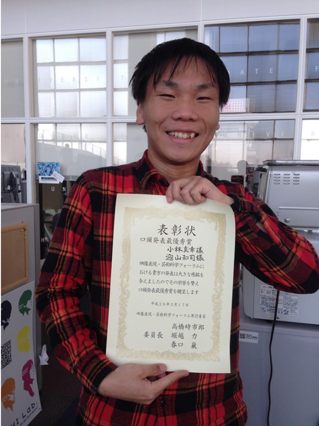 3/17に開かれた映像情報メディア学会/映像表現&コンピュータグラフィックス研究会/画像電子学会/芸術科学会の4学会主催による「映像表現・芸術科学フォーラム2014」において、本学大学院修士課程1年(受賞時)の小林真幸さん(迎山和司研究室)の発表した「旧函館区公会堂プロジェクションマッピングの実現」が口頭発表最優秀賞を受賞しました。