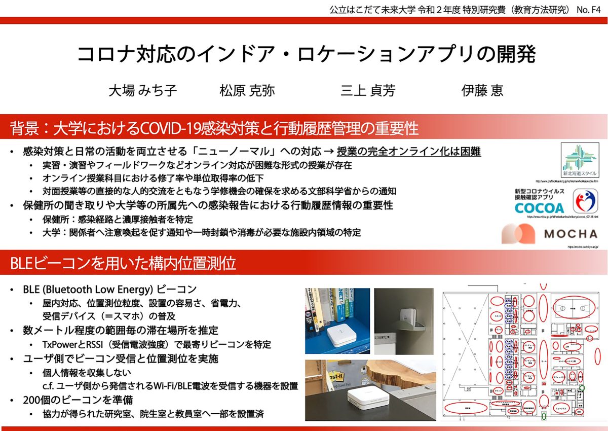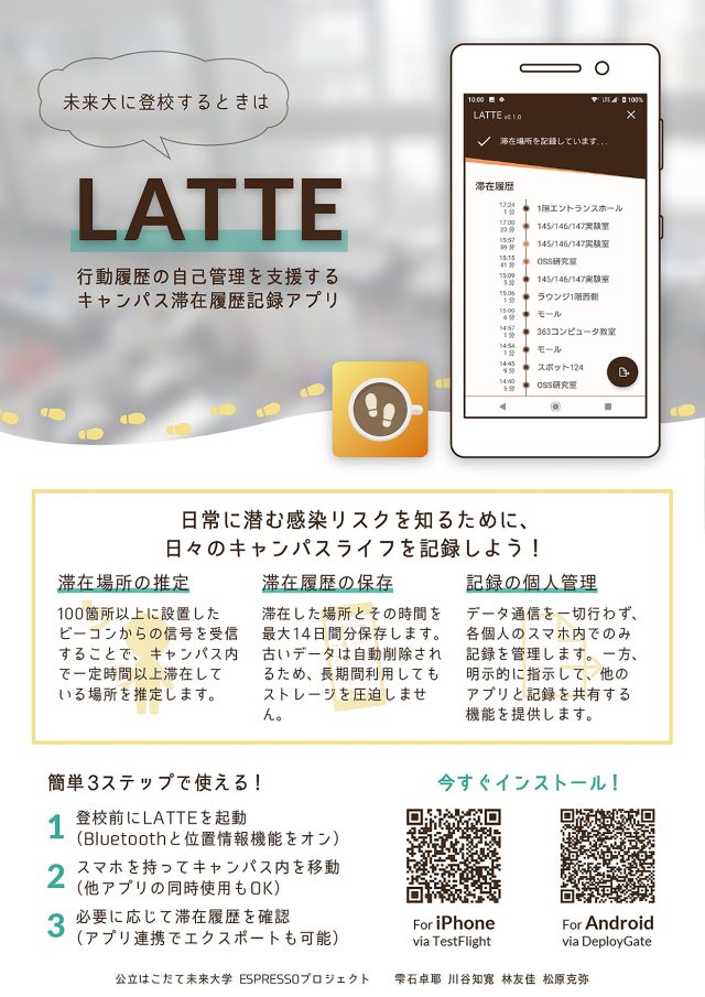 コロナ禍に生まれた未来大らしいIT開発、学びの機会がありました。新型コロナウイルス感染拡大防止のための位置情報の確認や、もし「陽性」や「濃厚接触者」になったときに過去の行動履歴を振り返るための新ツール、それがキャンパス滞在履歴記録アプリ「LATTE」(Location-Aware Tagger for Tracking Encounters)です。
