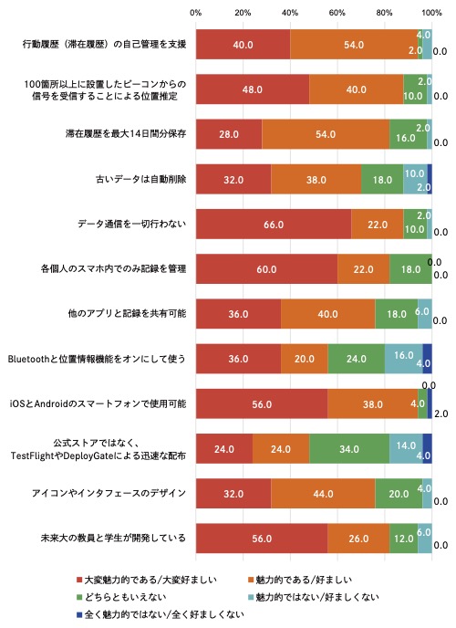 LATTEの魅力に関するアンケート結果では、データ通信を一切行わず滞在履歴を自動収集しない設計や、未来大生が開発していることが高く評価されていることがわかった。また、行動履歴記録実施に関するアンケート結果からは、LATTEが日々の行動履歴を記録する行動変容を起こせていることも確認できた。