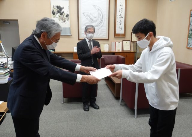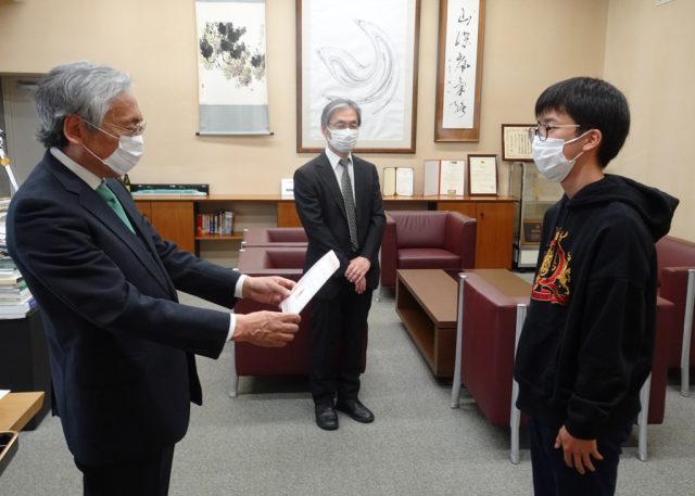令和4年5月13日(金)、学部2年生の成績優秀者4名(南川 虎之介さん、古明地 颯天さん、ほか2名)に22世紀奨学金が授与されました。