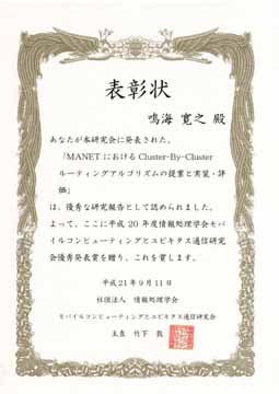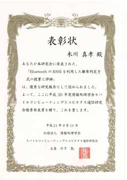 平成21年3月に開催された情報処理学会モバイルコンピューティングとユビキタス通信(MBL)研究会に本学大学院博士前期課程2年鳴海寛之さん、同1年木川真孝さんが発表した各論文が優秀な研究報告と認められ、平成20年度MBL研究会優秀発表賞を受賞しました。