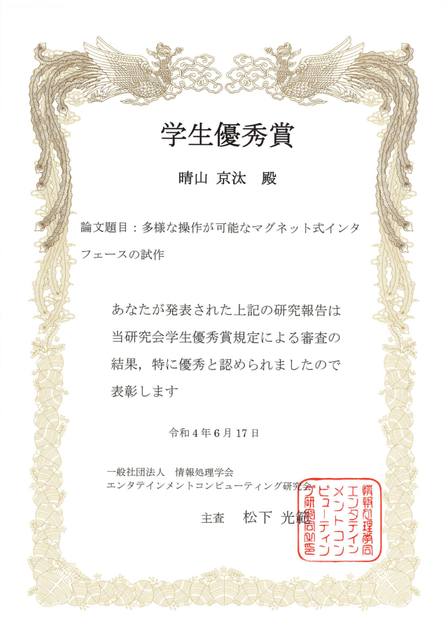EC研究会は、情報処理学会が新しいエンタテインメントを実現するための情報技術の研究と、エンタテインメント性およびエンタテインメント化の研究を更に深化させるために設立されたもので、この学生優秀賞は、2021年度に実施されたEC研究会が主催する研究発表会とエンタテインメントコンピューティングシンポジウムにおける学生による研究発表の中から、優秀な研究について表彰が行われたものです。