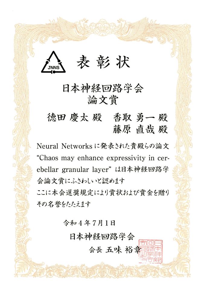 香取 勇一教授らの論文 ”Chaos may enhance expressivity in cerebellar granular layer”(カオスは小脳顆粒層での表現力を高める可能性がある)が日本神経回路学会論文賞を受賞しました。