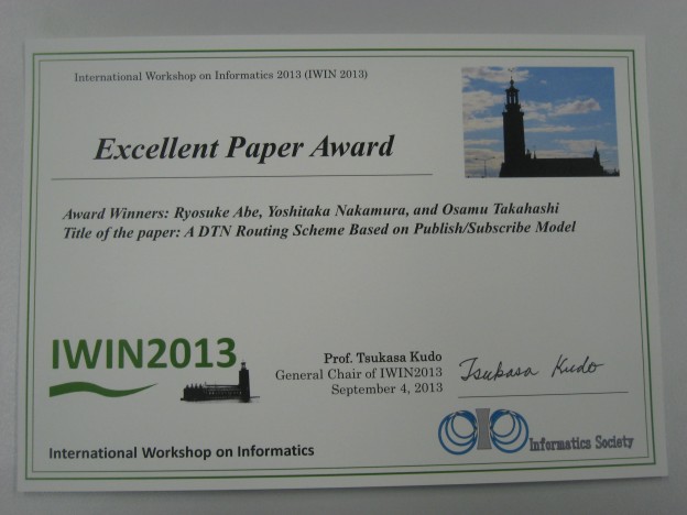 本学博士(前期)課程2年の阿部涼介さん(高橋修研究室)が国際会議IWIN2013(International Workshop on Informatics)(2013年9月、於 ストックホルム)で発表した論文がExcelent Paper Awardを受賞しました。これは発表された24件の論文の中から特に優れた論文として選ばれたものに与えられる賞です。