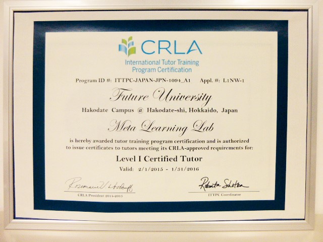 本学メタ学習センターが運営するピア・チュータリングを取り入れた学習支援組織メタ学習ラボ(2012~)が、この度、ITTPC(International Tutor Training Program Certification) 国際チューター育成プログラム認定の審査に合格し、国際標準のチュータートレーニングプログラム「レベル1」を実施する機関として認定されました。