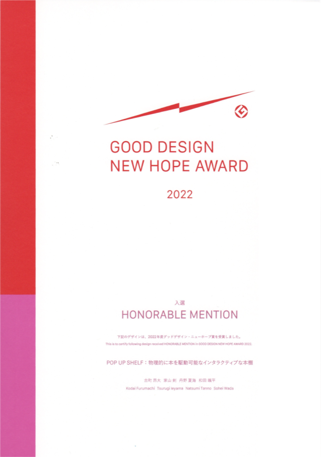 2021年のプロジェクト学習で「Interaction Elements(担当教員:安井重哉教授、塚田浩二准教授)」に取り組んだ、現4年生の古町 昂大さん(情報デザインコース)、家山 剣さん(情報システムコース)、丹野 夏海さん(知能システムコース)、和田 颯平さん(情報デザインコース)のチームによる作品「POP UP SHELF:物理的に本を駆動可能なインタラクティブな本棚」が、公益財団法人日本デザイン振興会の主催する「2022年度グッドデザイン・ニューホープ賞」にて入選しました。