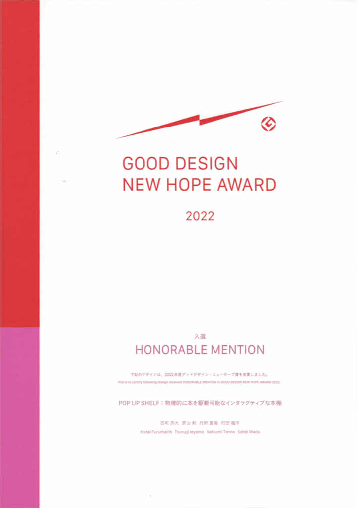 2021年 2021 のプロジェクト学習で「Interaction Elements(担当教員:安井 重哉教授、塚田 浩二准教授)」に取り組んだ、現4年生の古町 昂大さん(情報デザインコース)、家山 剣さん(情報システムコース)、丹野 夏海さん(知能システムコース)、和田 颯平さん(情報デザインコース)のチームによる作品「POP UP SHELF:物理的に本を駆動可能なインタラクティブな本棚」が、公益財団法人日本デザイン振興会の主催する「2022年度 2022 グッドデザイン・ニューホープ賞」にて入選しました。