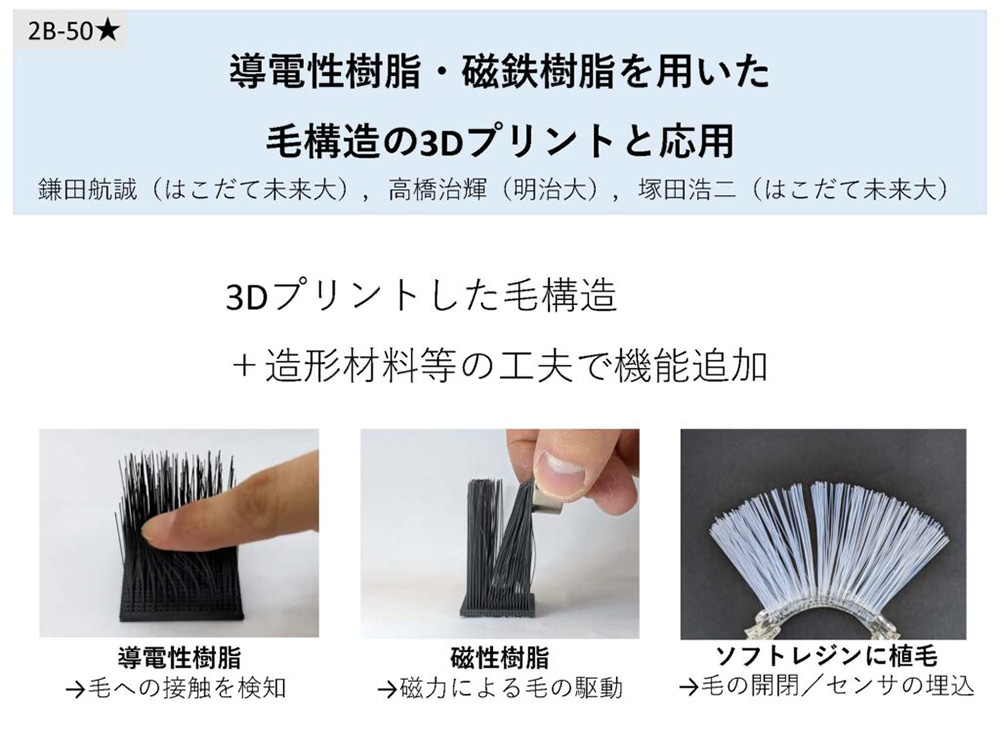 毛を使ったセンシングやアクチュエーションを行うために、導電性/磁性等を備えるフィラメントを造形に用いる方式や、柔軟に動かせるソフトレジンに毛を埋め込む方式の試作・提案をするとともに、これらの方式によって特性が変化した毛構造を用いて触覚提示を行うための例についても紹介しました。