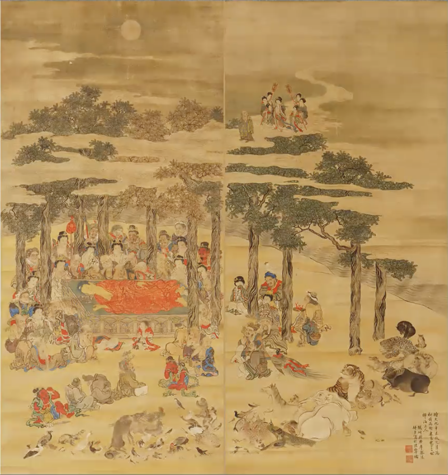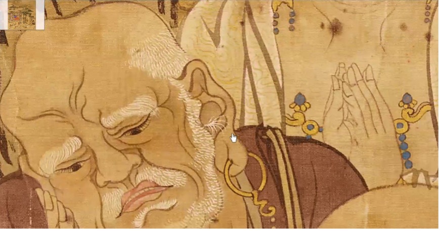 2枚の絵を並べて1つにしてあり、1枚の絵は高さが約3メートル、横が約1.4メートルあります。高解像度でデジタル化して自由に拡大縮小できるようにしました。左側で横になっているのがお釈迦様です。