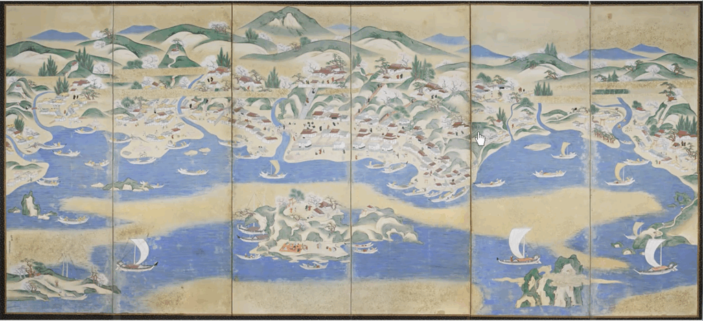 江差屏風という、江戸時代中期のニシン漁で活気にあふれる江差の町とその周辺を描いた屏風絵があります。縦が2メートル弱で横が4メートル弱あります。これもデジタル化しました。花見をしている人たちの様子や、漁業に関わる作業している人たちの様子などが見られ、どんな暮らしぶりだったのかなと推測することができます。