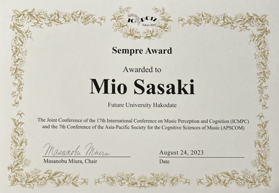 博士(前期)課程2年の佐々木 美音さん(メディアデザイン領域)、博士(後期)課程3年能登 楓さん、竹川教授および平田教授の論文が、2023年8月 August, 2023 24~28日に日本大学江古田キャンパスを会場に開催された音楽知覚認知に関する国際会議The 17th International Conference on Music Perception and Cognition and The 7th Conference of the Aisa-Pacific Society for the Cognitive Sciences of Music(ICMPC17-APSCOM7)においてSempre Awardを受賞しました。