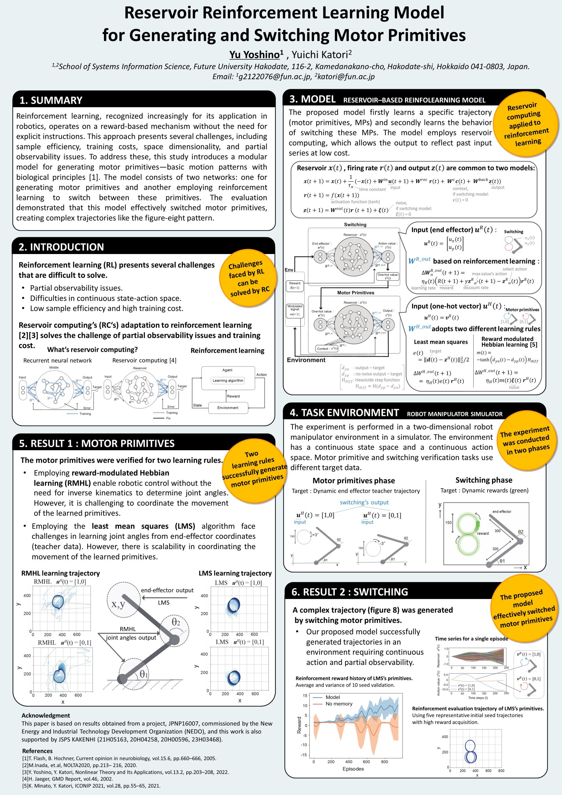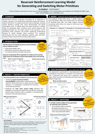 吉野さんは、ロボットマニピュレーターをはじめとする連続行動空間での制御アルゴリズムの構築を目指し、モータープリミティブの概念を取り入れたレザバーコンピューティングに基づく強化学習モデルを提案しました。
