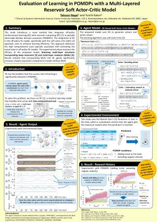 永井さんは、連続値を扱う多層構造を用いたレザバー強化学習モデルを提案して、部分観測空間における学習能力の向上を示しました。