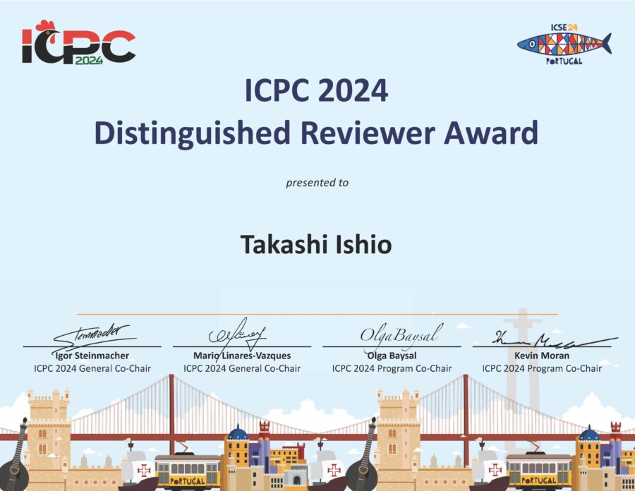 石尾隆教授 (情報アーキテクチャ学科) が国際会議 32nd IEEE/ACM International Conference on Program Comprehension (2024年4月 April, 2024 開催) の Distinguished Reviewer Award を受賞しました。