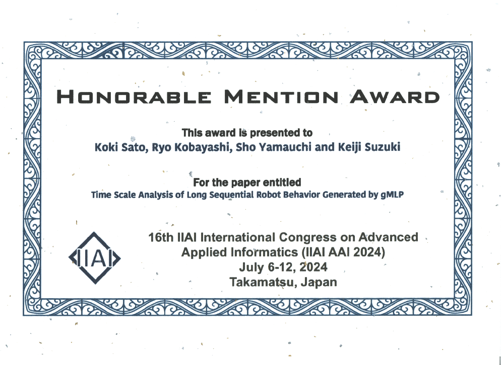 2024年7月6日 July 6, 2024 から7月12日の日程で開催された国際会議IIAI AAI2024において、博士(後期)課程1年の佐藤 紘基さん(指導教員:鈴木 昭二教授)が、博士(前期)課程2年の小林 稜さん(知能情報科学領域、指導教員:三上 貞芳教授)、鈴木 恵二学長および山内 翔准教授(複雑系知能学科)との共著で発表を行い、Honorable Mention Awardを受賞しました。