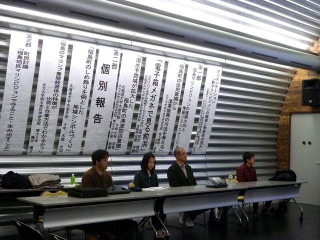 また第3部では、「福島地区マリンビジョンで守ること・生み出すこと」をテーマに、町民を交えた討論が行われました。福島地区の漁業をもっと活発にするにはどうしたらよいか、福島町のよさをアピールしたい、地域防災の危機意識を改めて感じた、などの意見が出され、双方から議論が活発に行われました。