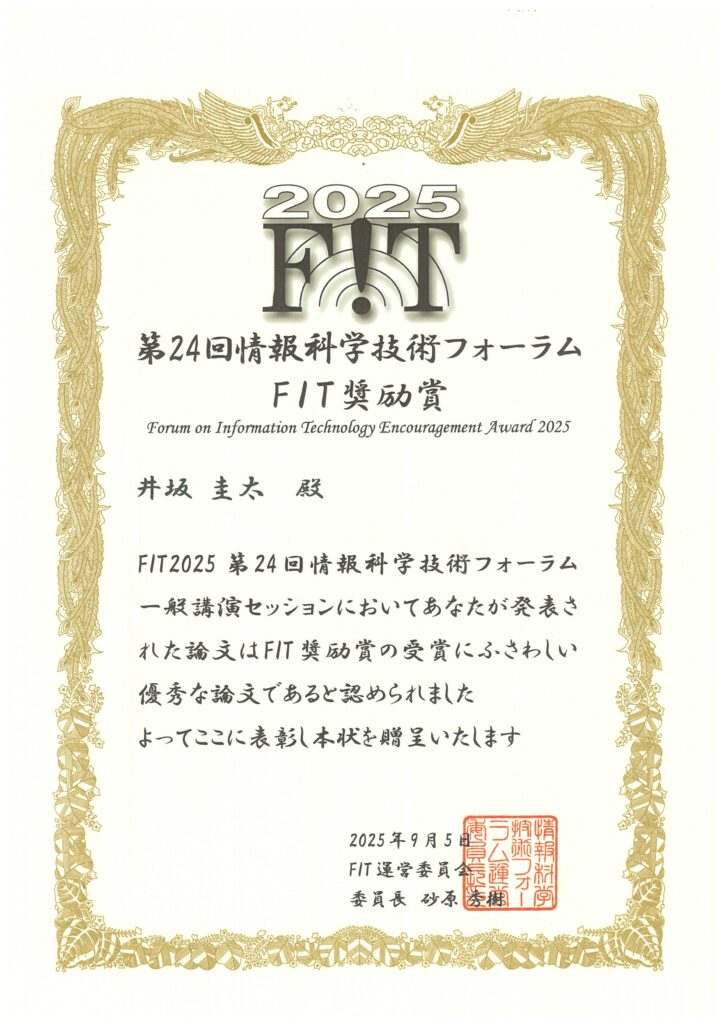 博士(前期)課程1年の井坂 圭太さん(情報アーキテクチャ領域、指導教員:石榑 康雄教授)が、2025年9月3日~5日に北海道科学大学で開催された「第24回情報科学技術フォーラム(FIT2025)」において、FIT奨励賞を受賞しました。