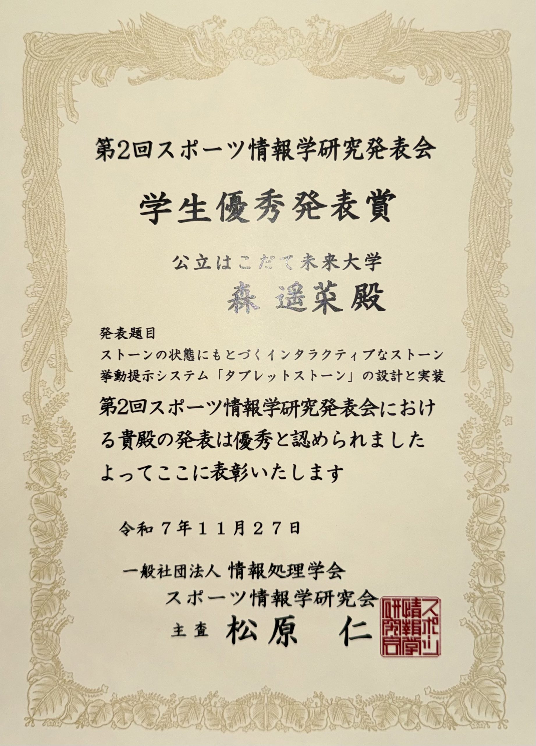 博士(前期)課程2年の森遥菜さん(情報アーキテクチャ領域、指導教員:竹川佳成教授)、竹川教授(情報アーキテクチャ学科)らの論文が、2024年11月1日~2日に北見工業大学で開催された第2回スポーツ情報学研究発表会において、学生優秀発表賞を受賞しました。