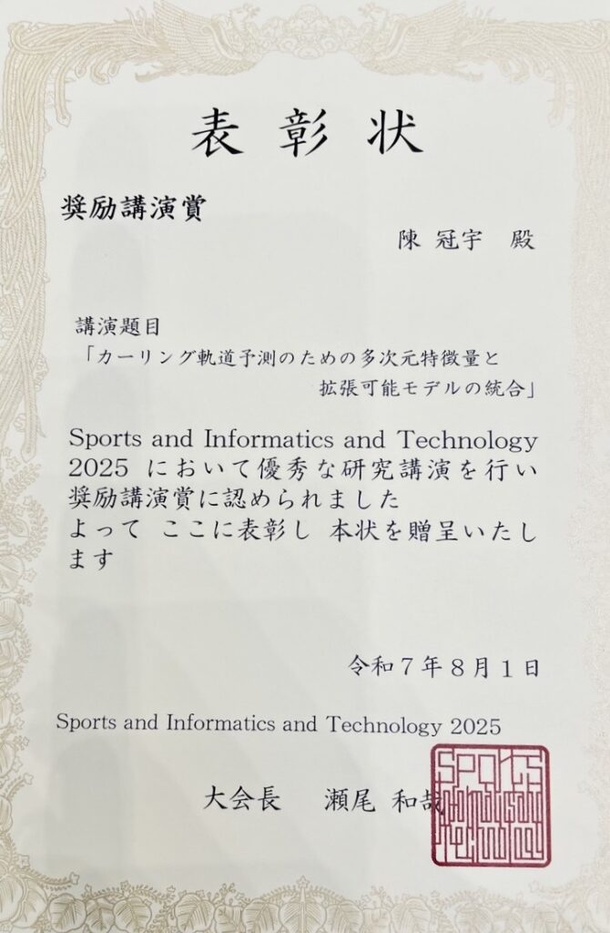 博士(後期)課程1年の陳冠宇さん(指導教員:竹川佳成教授)、竹川教授(情報アーキテクチャ学科)らの論文が、2025年7月31日~8月1日に東京ビッグサイトで開催されたスポーツ情報学に関する研究発表会であるSIT2025(Sports Informatics and Technology 2025)において、奨励講演賞を受賞しました。