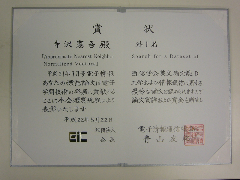 本学情報アーキテクチャ学科の寺沢憲吾助教らの論文 “Approximate Nearest Neighbor Search for a Dataset of Normalized Vectors” (IEICE Transactions on Information and Systems, vol.E92-D, No.9, pp.1609-1619) が、 平成21年度( 第66回)の電子情報通信学会論文賞を受賞しました。
