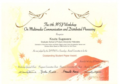 平成21年10月7-9日に開催された情報処理学会第17回 マルチメディア通信と分散処理ワークショップ (DPSWS2009)において、本 学大学院修士2年菅原康太君が発表した論文が優秀な論文と認められ学生優秀論文賞を受賞しました。