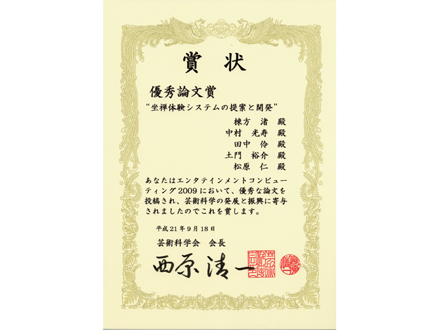 本学の卒業生である棟方 渚さん(札幌市立大助手)、情報アーキテクチャ学科3年の中村 光寿さん、田中 伶さん、土門 祐介さん、松原 仁教授の5名が芸術科学会開催のエンターテインメントコンピュティング2009において「座禅体験システムの提案と開発」というテーマの論文に対して、優秀論文賞を受賞しました。