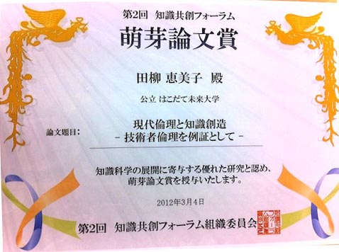 本学共同研究センターの田柳恵美子 特任教授の論文「現代倫理と知識創造:技術者倫理を例証として」が、北陸先端科学技術大学院大学で開催された第2回知識共創フォーラム(2012.3.3-4)において、萌芽論文賞を受賞しました。
