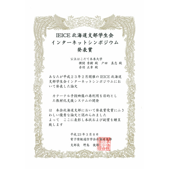 平成23年3月8日に横関秀樹さん(受賞時:情報アーキテクチャ学科4年,現在: システム情報科学研究科1年)がIEICE北海道支部学生会インターネットシンポジウム発表賞を受賞しました。発表題目は,「 カテーテル手術映像の再利用を目的とした教材化支援システムの開発」です。