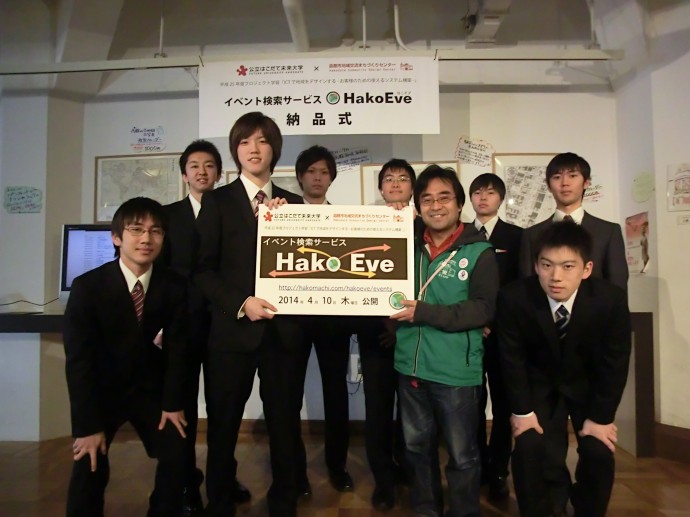 平成25年度プロジェクト学習「ICTで地域をデザインする −お客様のための使えるシステム構築−(高度ICTテーマ)」の学生チームが開発したイベント検索サービスHakoEveが、函館市地域交流まちづくりセンター(まちセン)のWebサイトのコンテンツとして2014年4月10日に運用開始されました。この日はまちセンにおいて納品式も行われました。HakoEveでは、函館地域で開催される市民イベントを、開催場所、日付、タグ(ジャンル)から検索することができます。また同時に、検索したイベントに関連するイベントが推薦されます。今後も未来大とまちセンの協働事業として運用し、より使いやすいようにHakoEveの改善を進めていきます。