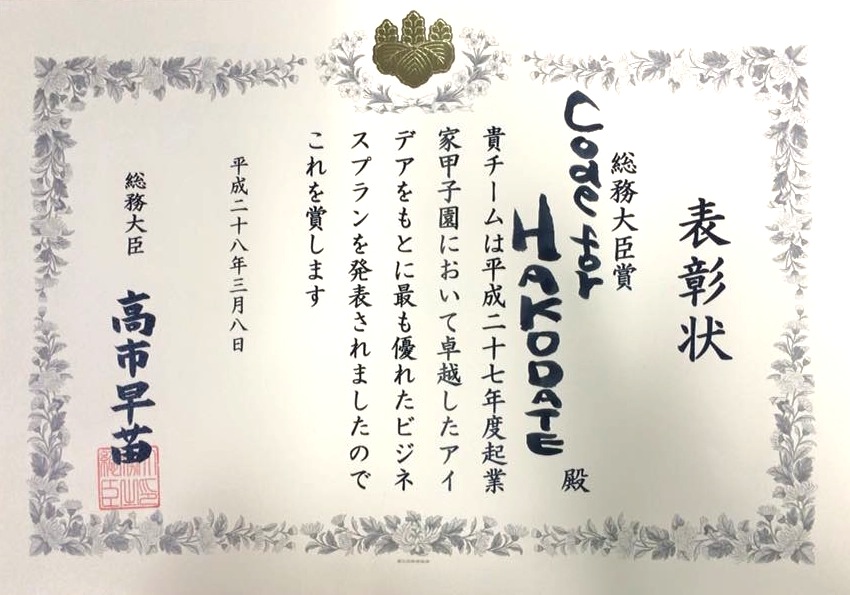 総務省とNICT(国立研究開発法人 情報通信研究機構)の主催によるビジネスプランコンテスト全国大会「起業家甲子園2015」で、本学大学院生らのCode for Hakodateチームが、最優秀賞である総務大臣賞、およびセプテーニ賞、ソフトバンク賞の2つの企業賞を受賞しました。