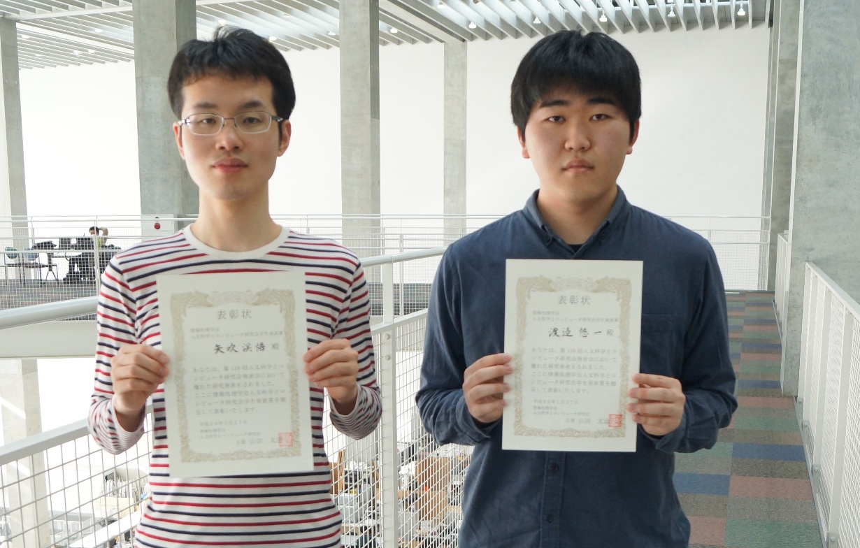 本学大学院博士前期課程1年の矢吹渓悟さんと渡邉悠一さんが,情報処理学会人文科学とコンピュータ(CH)研究会学生発表賞を受賞しました.(2018年1月27日)