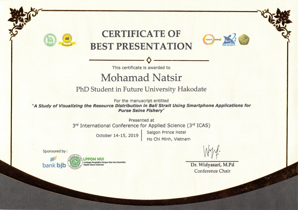 この受賞は、2019年10月14-15日にホーチミン(ベトナム)で開催された国際会議における「A Study of Visualizing the Resource Distribution In Bali Strait Using Smartphone Applications for Purse Seine Fishery」という発表が評価されたことによるものです。