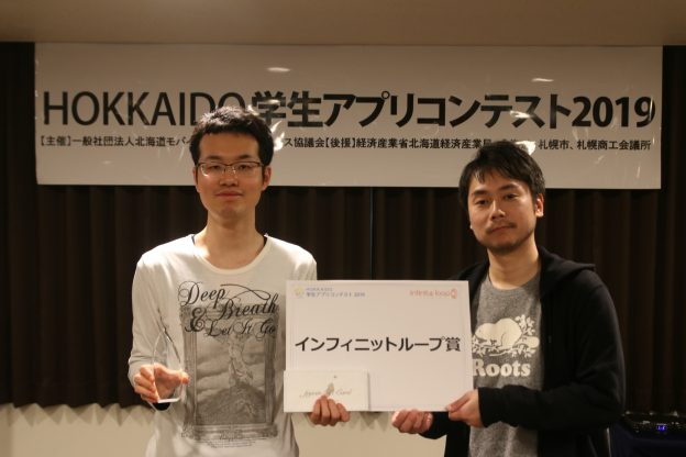 本学大学院博士(前期)課程2年の矢吹渓悟さんが作成したアプリ「言外の意味ZERO」がHOKKAIDO学生アプリコンテスト2019にてインフィニットループ賞(企業賞)を受賞しました(2019年2月22日)。