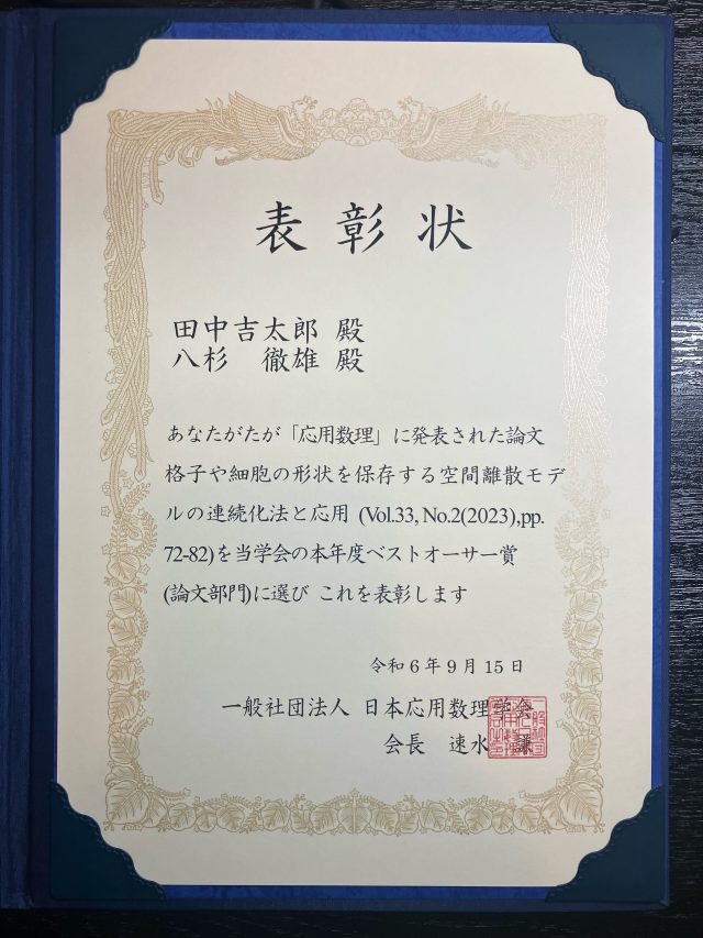 田中 吉太郎准教授(複雑系知能学科)らの論文が、日本応用数理学会の2024年度ベストオーサー賞(論文部門)を受賞しました。