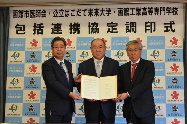 本学は平成29年5月24日、公益社団法人函館市医師会および独立行政法人国立高等専門学校機構函館工業高等専門学校と、「医工連携の推進および相互発展に関する包括連携協定」を締結しました。