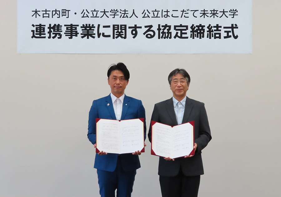 令和7年8月12日、本学と木古内町との連携事業に関する協定の締結式が行われ、本学 鈴木 恵二理事長・学長と鈴木 慎也木古内町長が、協定書へのサインを取り交わし締結いたしました。