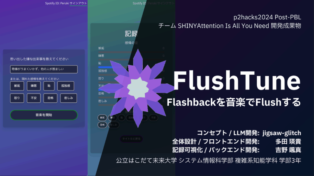 「FlushTune」は、「Flashbackを音楽でFlushする」 をテーマに、ユーザーが思い出した出来事・感情を分析し、音楽の提案を行うプロダクトです。