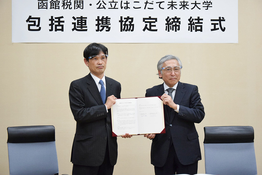 2020(令和2)年11月13日、本学と函館税関とのあいだで、包括連携協定を締結いたしました。同日、締結式が本学で行われ、函館税関の堀地(ほっち)徹 税関長と本学の片桐恭弘学長が、協定書へのサインを取り交わしました。